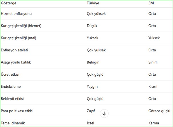 Türkiye–EM karşılaştırması, hizmet enflâsyonunun Türkiye’de klasik kur geçişkenliği anlatısından koptuğunu ve parasal aktarım mekanizmasının bu alanda sınırlı çalıştığını göstermektedir. Kur istikrarı ve parasal sıkılaşma, mal enflâsyonunun kontrol altına alınmasında etkili olmakla birlikte, hizmet fiyatları üzerinde aynı ölçüde sonuç üretmemektedir. Bu durum, enflâsyonla mücadelenin yalnızca makroekonomik denge değişkenlerine dayandırılamayacağını açık biçimde ortaya koymaktadır.